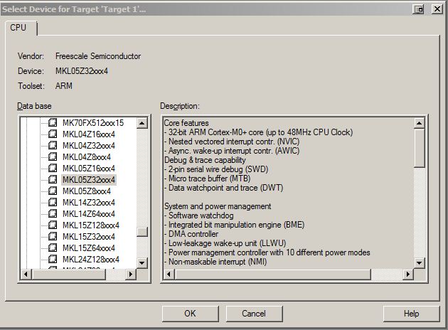 Create new folder (I name mine KL05_demo) and copy there entire folder mbed which is inside build directory. Open KEIL, select Project on the top toolbar and create a new project inside our new created directory. It asks you to choose a processor, MKL05Z32xxx4 is assembled on the freedom KL05Z.