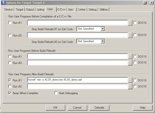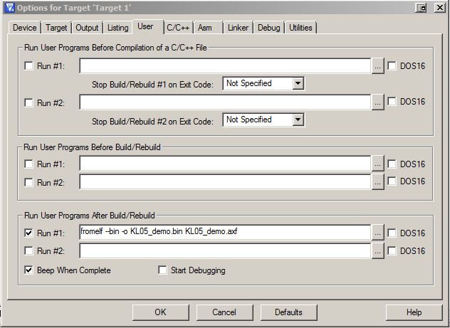 The tab which we start with, it's User. Add there fromelf --bin -o test05_KL05Z.bin test05.axf