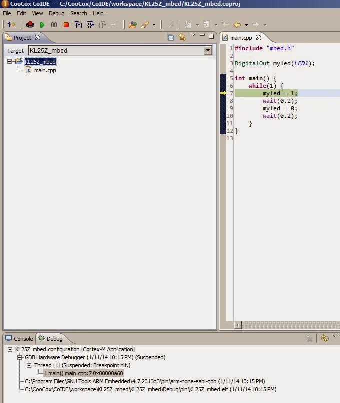 Connect your board which mbed interface (CMSIS-DAP) and click on Debug icon (or press CTRL+F5). Debugging starts, it puts the breakpoint inside the main function, as it's shown in the picture below.