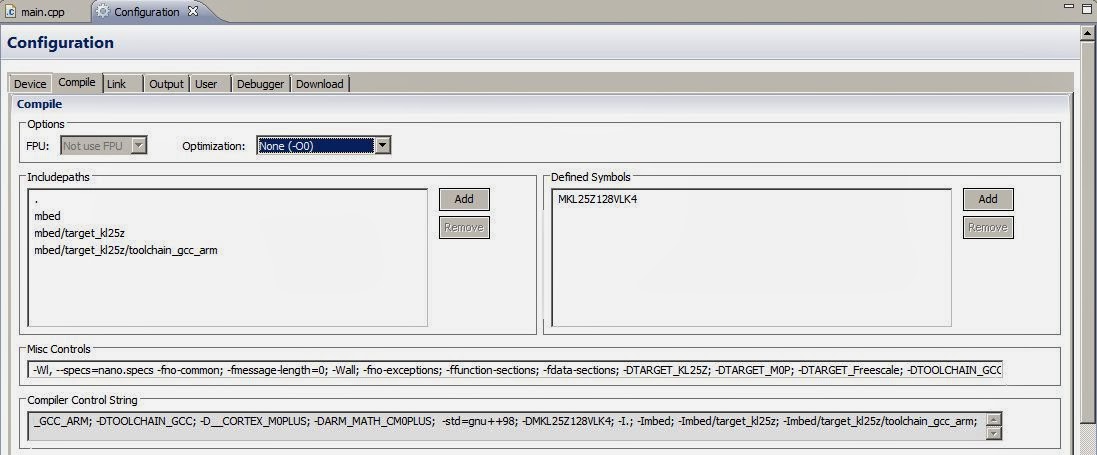 Add include paths (mbed folder, target_kl25z folder inside and the toolchain_gcc_arm which is inside target_kl25z folder). Add to Misc. Controls:
