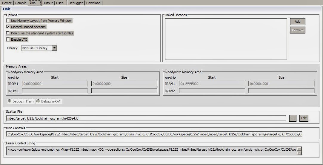 We could add those defines up there to Defined Symbols, does not matter though. This should be for compile tab, move to the Link tab.